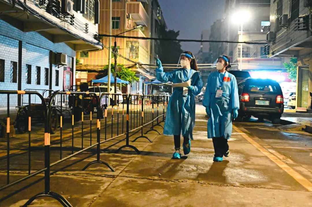 ▲夜色下,饿得饥肠轱辘的“娘子军”在社区“扫楼”,全面摸排居民核酸检测情况,她们腰杆挺直,专注专心,不愧为抗“疫”一线的最美逆行者