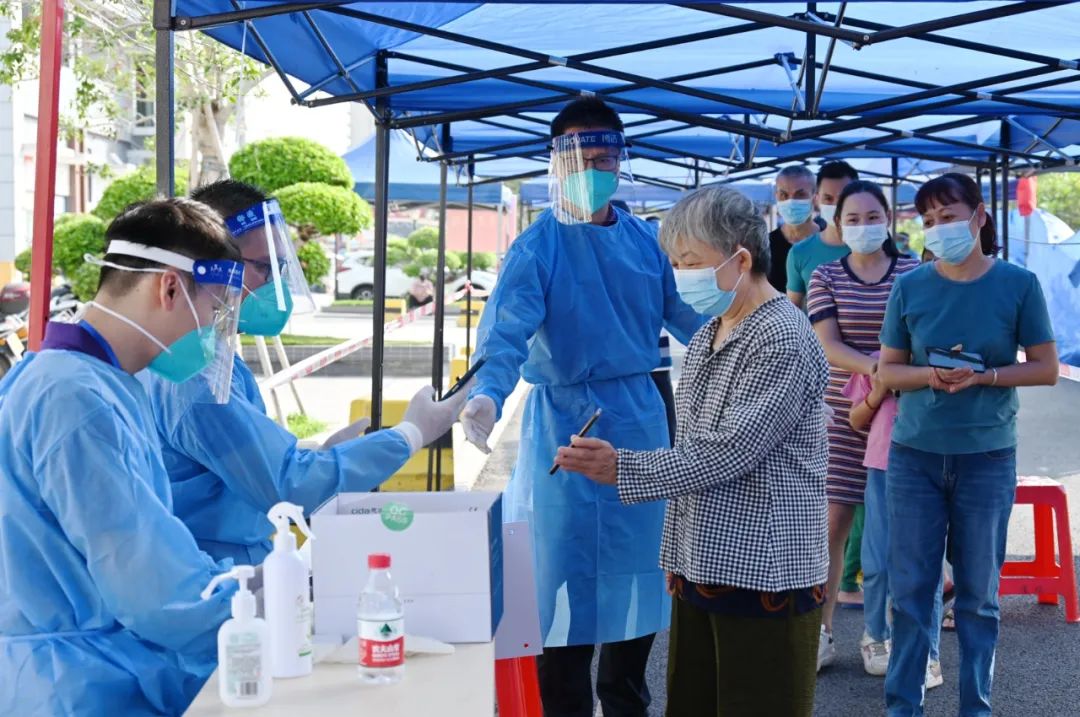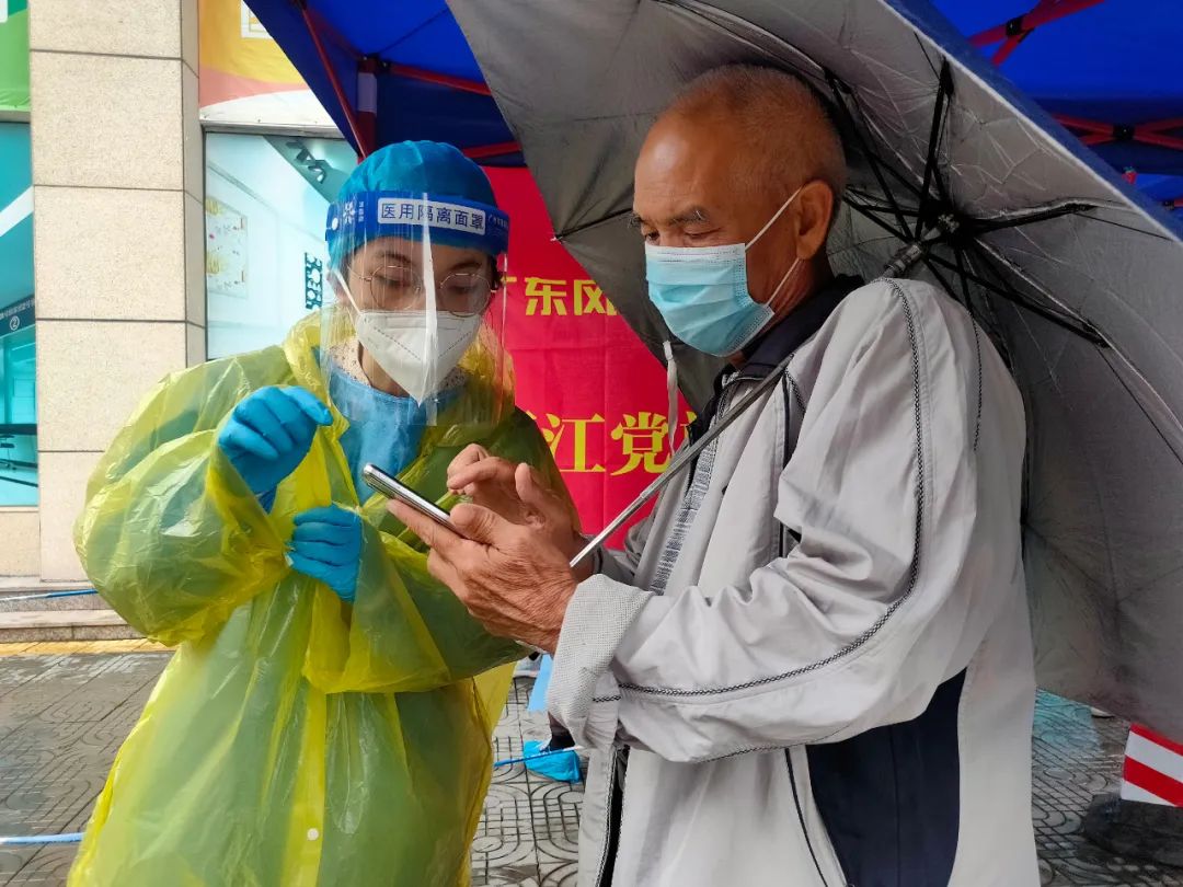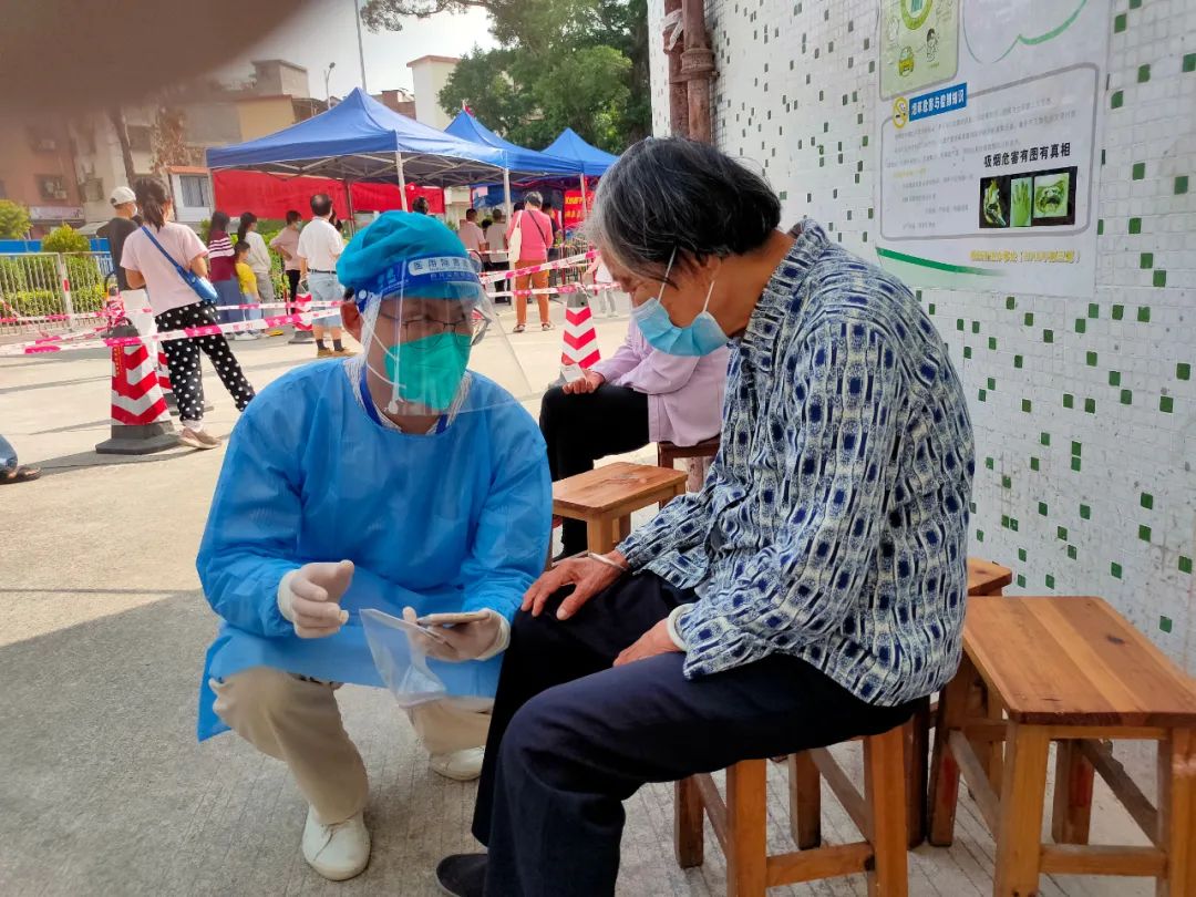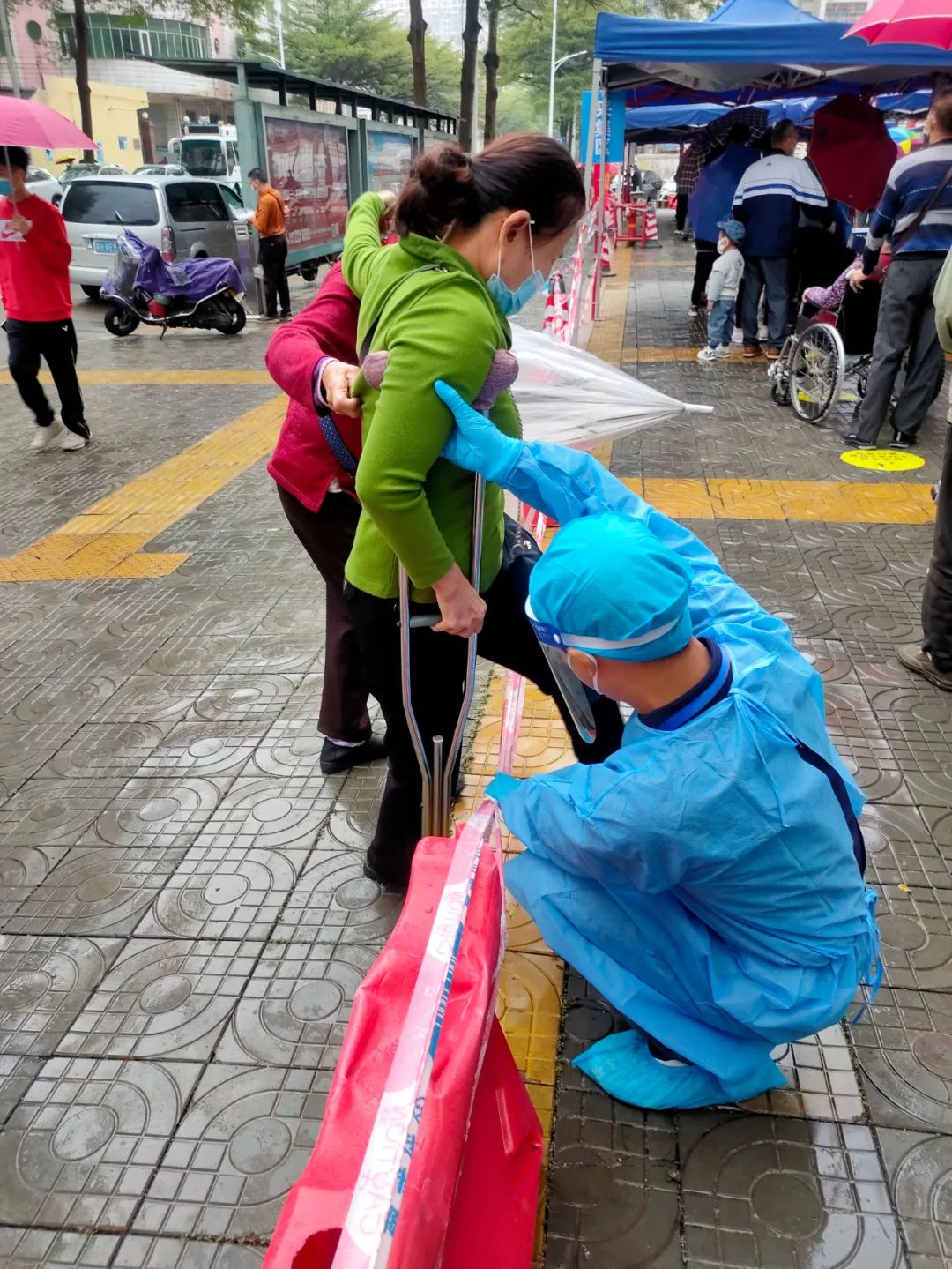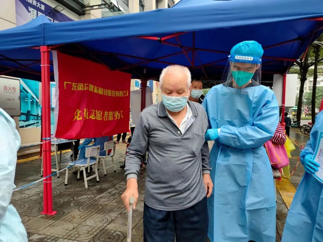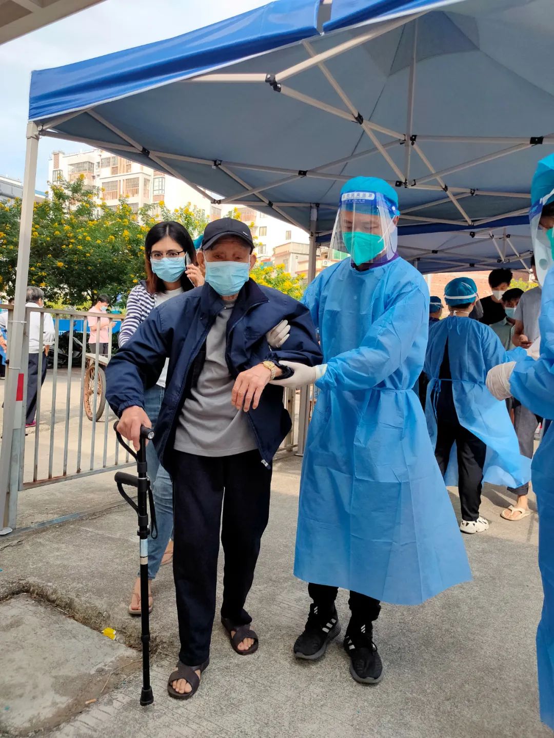 ▲贴心!志愿者热情搀扶行动不便的老人完成核酸检测