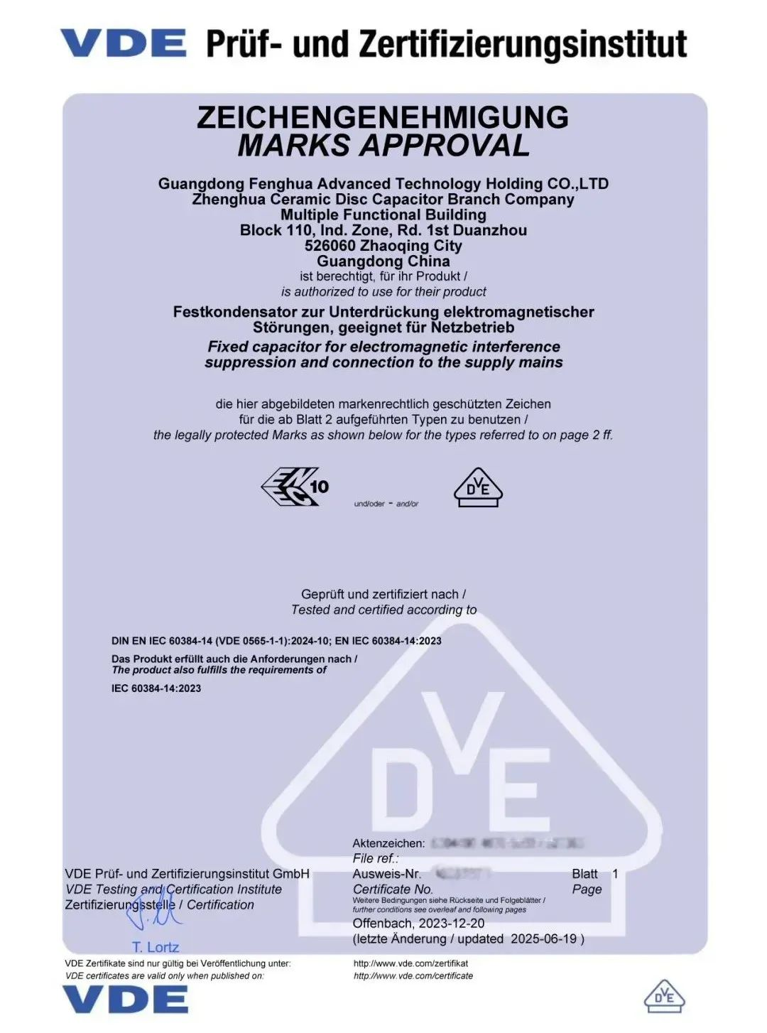 近日,利来国际高科正华分公司双芯串联Y1电容器成功通过最新版国际标准DIN EN IEC 60384-14 (VDE 0565-1-1):2024-10;IEC 60384-14:2023的测试,荣获最新版VDE/ENEC证书以及附录H直流1500V认证,标志着产品技术与质量跻身国际先进行列。