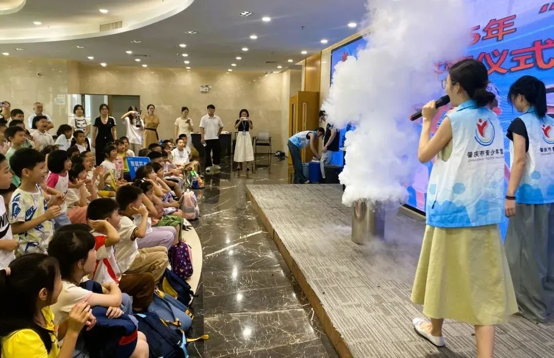 孩子们在团队协作游戏、趣味自我介绍等破冰行动中融入团队,在欢笑中结识新朋友。随后,一场精彩绝伦的“科学魔法剧场”将现场气氛推向高潮:教师们化身“魔法师”,为孩子们呈现了一场视觉与思维的双重盛宴。在“火焰掌”环节,老师双手燃起熊熊烈焰却毫发无伤,引得全场惊呼不断;“液氮爆炸”实验时,随着一声巨响,白色“蘑菇云”腾空而起,孩子们不约而同地发出“哇”的赞叹;最令人称奇的是“空气炮”表演,无形的气流精准击倒纸杯塔阵,热烈的掌声经久不息。
