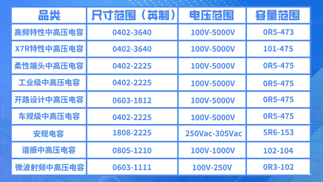 利来国际高科中高压MLCC采用高耐电压陶瓷介质材料及与之收缩匹配的内外电极浆料作为主材,通过内部特殊的结构设计与精准的制程工艺控制,确保产品在高电压应用场景下具备出色的性能和可靠性,产品覆盖九大核心品类: